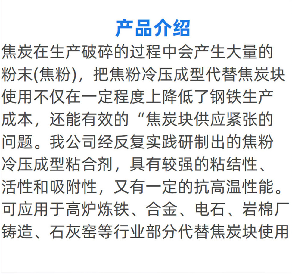 产品先容:焦炭在生产破碎的历程中会爆发大宗的粉末(焦粉),,,,,,,,把焦粉冷压成型取代焦炭块使用不但在一定水平上降低了钢铁生产本钱,,,,,,,,还能有用的*焦炭块供应主要的问题。。。。。。。我公司经重复实践研制出的焦粉冷压成型粘合剂,,,,,,,,具有较强的粘结性、活性和吸附性,,,,,,,,又有一定的抗高温性能……