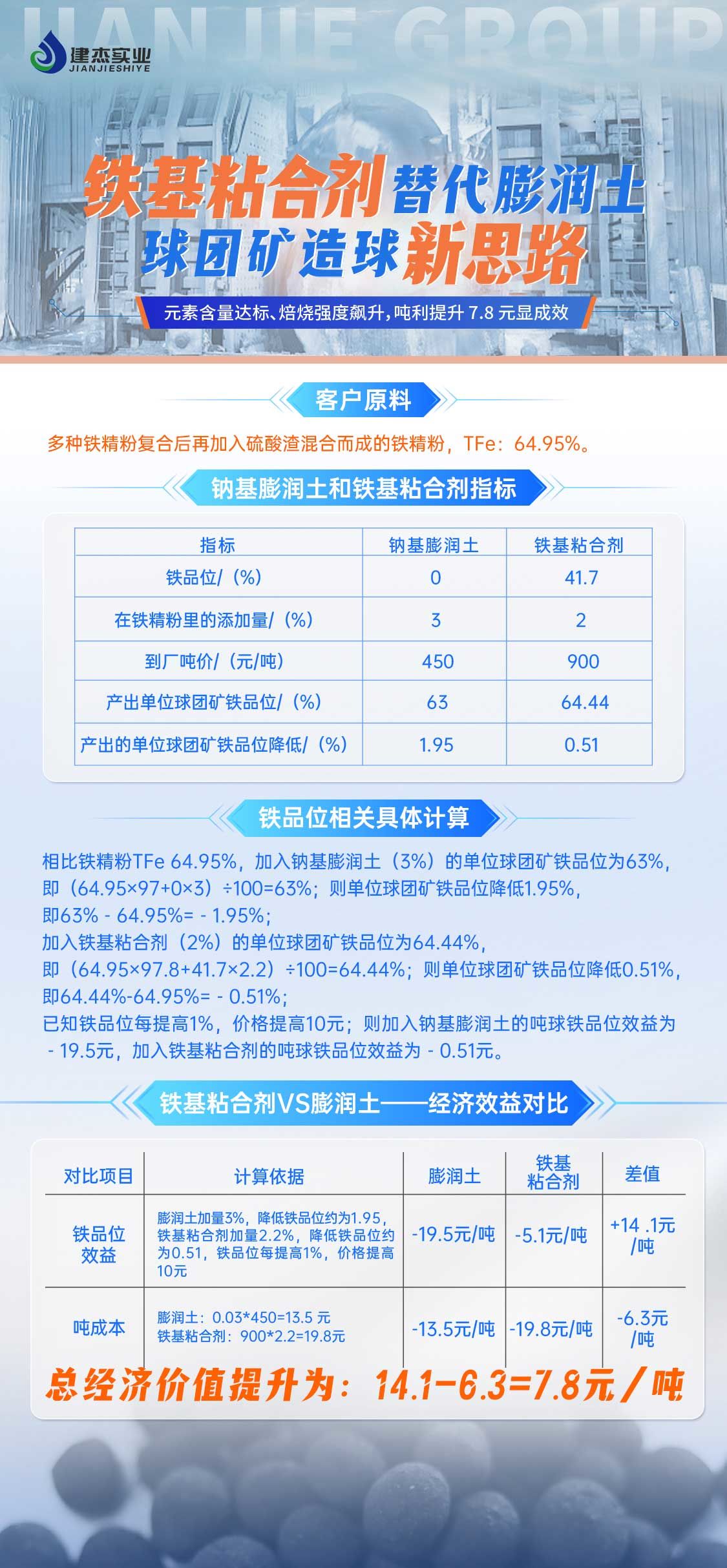 在铁品位效益上,,,,,,,,钠基膨润土为 -19.5 元 / 吨,,,,,,,,铁基粘合剂为 -5.1 元 / 吨,,,,,,,,差值达 +14.1 元 / 吨 。。。。。。。。吨本钱方面,,,,,,,,钠基膨润土:0.03450 = 13.5 元 / 吨;;;;;;;铁基粘合剂:9002.2% = 19.8 元 / 吨 ,,,,,,,,差值为 -6.3 元 / 吨 。。。。。。。。综合来看,,,,,,,,总经济价值提升为 14.1 - 6.3 = 7.8 元 / 吨 。。。。。。。。